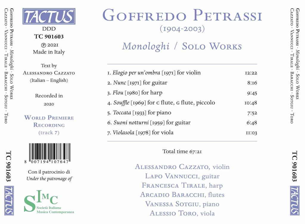 ‘Monologhi’ è un bellissimo progetto che racchiude per la prima volta insieme le composizioni per strumento solista di Goffredo Petrassi. Ad un certo punto del 2020, alla luce di tutto quello che abbiamo visto, per me ha assunto anche una sfumatura di significato in più. Sono molto entusiasta di aver partecipato a questo disco suonando in world premiere recording il brano “Violasola” (1978) con la suggestiva dedica: “a colui che, una sera, mi dettó…” .