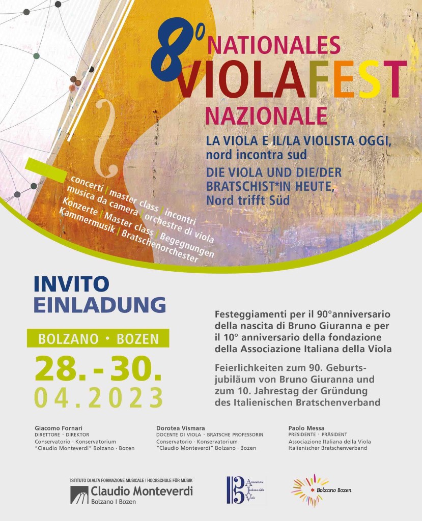 L’Associazione Italiana della Viola in collaborazione con il Conservatorio “Claudio Monteverdi” di Bolzano presenta l’8° ViolaFest Nazionale dal titolo “La Viola e il/la Violista Oggi, Nord incontra Sud” che si svolgerà dal 28 al 30 Aprile 2023.